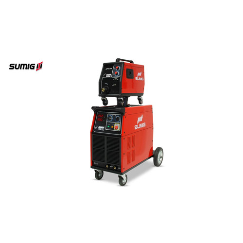 Máquina de solda MIG/MAG trifásica, com alimentador de quatrorolos engrenados, opção de regulagem de velocidades de arame de11/22m/min;